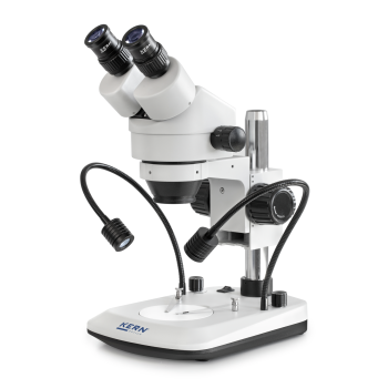 The KERN OZL 47 stereo microscope comes with 2 flexible 3W LED lamps, ensuring you always have the right illumination from the optimal angle. The microscope features an easily adjustable 7-45x continuous zoom. HWF (High Wide Field) eyepieces ensure comfortable long-term use without straining your eyes and are also suitable for eyeglass users.
